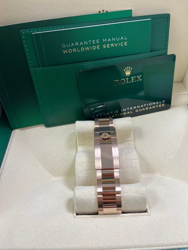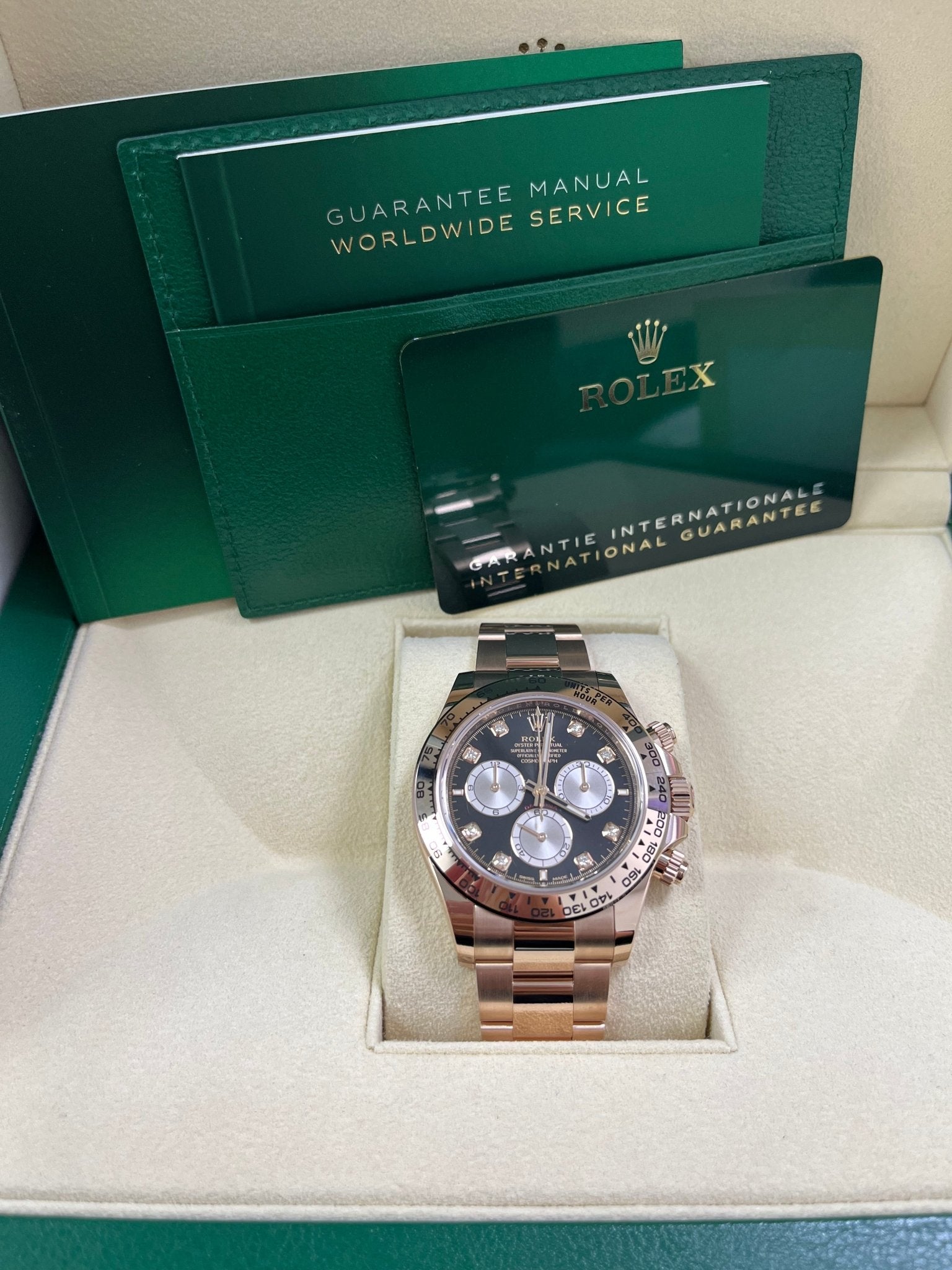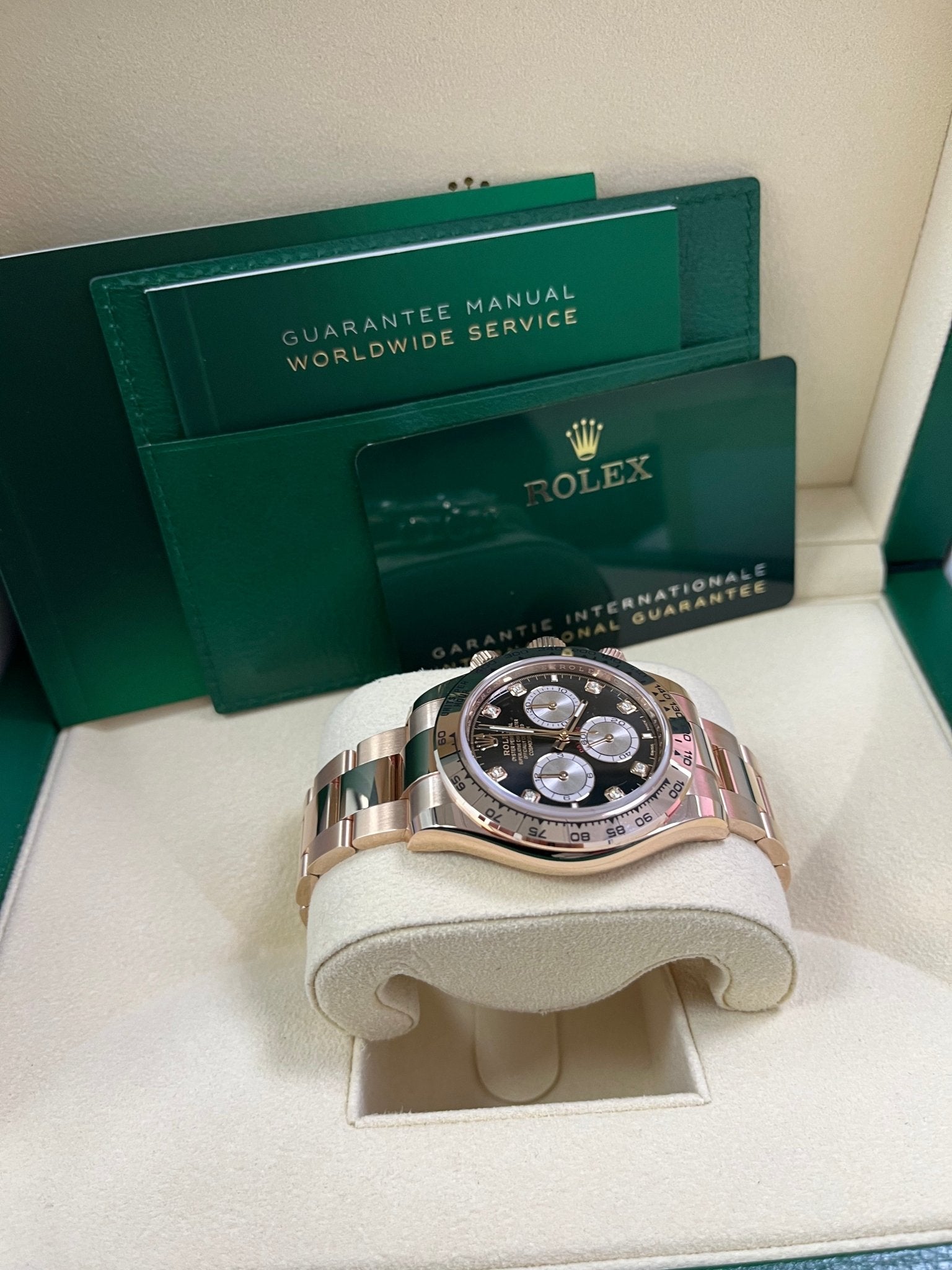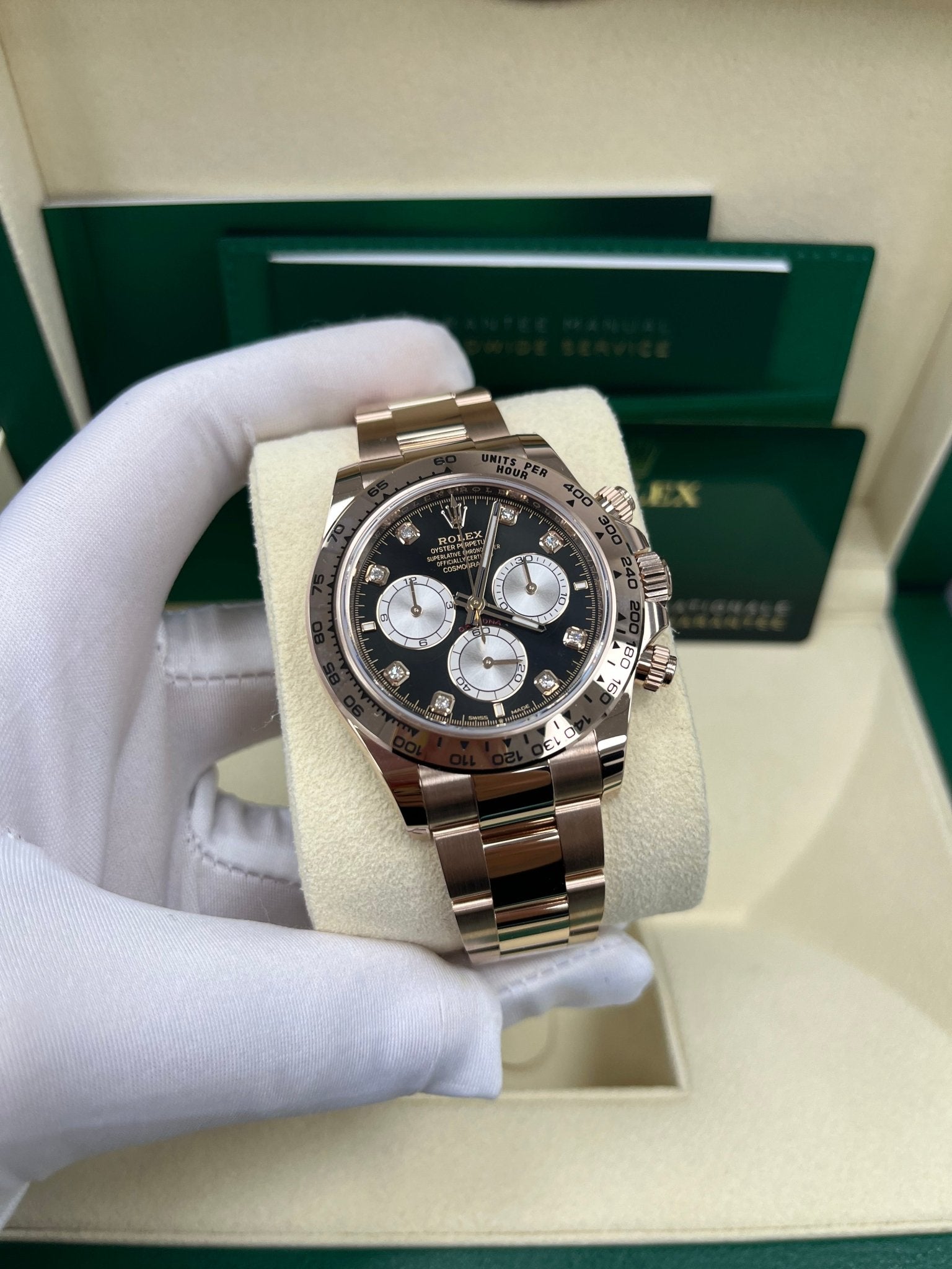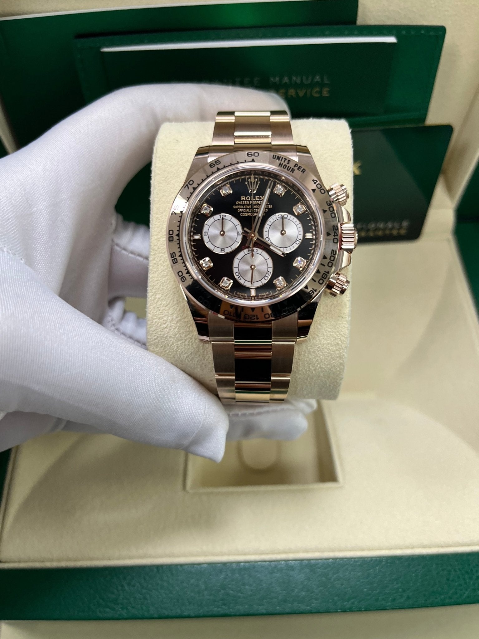 40 mm 18K Everose gold case, screw-down case back, screw-down crown with triple waterproofing system, fixed bezel engraved with 18K Everose gold tachymeter scale, scratch-resistant sapphire crystal, gloss black and sunray Dust dial, diamond hour markers, diamond hour markers, Rolex-made perpetual calendar, mechanical chronograph, self-winding movement with central hour and minute hands, small seconds at 6 o'clock, timing via central seconds hand, 30-minute counter The dial is located at 3 o'clock and there is a 12-hour counter at 9 o'clock. The stop-second device can accurately set the time. The power reserve is about 72 hours. The Oyster bracelet is equipped with three-piece solid links and a folding Oysterlock safety belt buckle. Easylink 5mm comfort extension links. Waterproof to 100M.